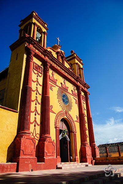 La portada del templo es de un solo cuerpo; al centro se localiza un vano de acceso con arco de medio punto decorado con guirnaldas vegetales en argamasa; sobre éste un óculo como ventana del coro, con decoraciones lineales en forma de rayos; este vano está encuadrado con motivos vegetales estilizados; a los lados del acceso principal se encuentran dos columnas adosadas, con base cuadrada con decoraciones geométricas fuste estriado a la mitad y capitel compuesto; en las entrecalles hay decoración vegetal.